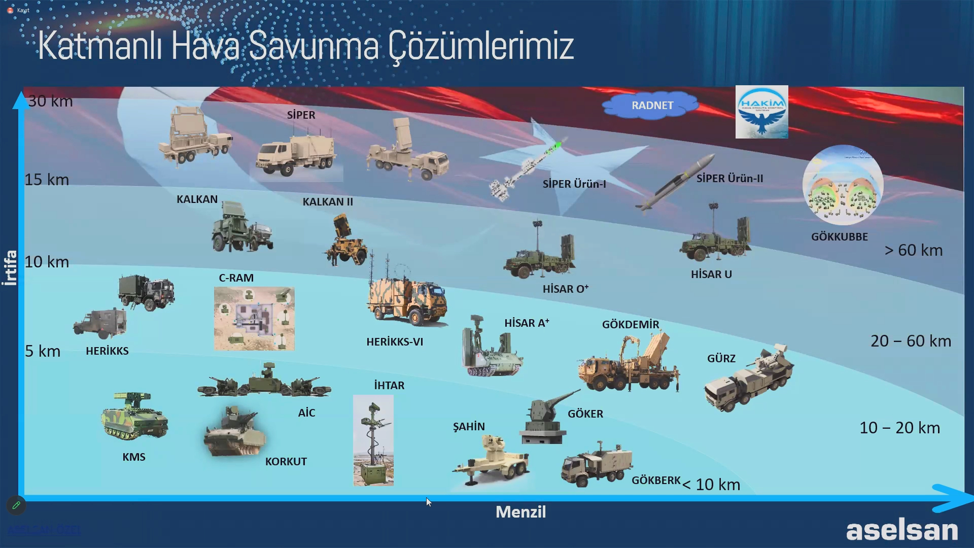 ASELSAN Genel Müdürü Ahmet AKYOL, toplantının ikinci kısmında ASELSAN’ın geliştirdiği hava savunma çözümleri hakkında da güncel bilgiler paylaştı. Öncelikle hava savunma sistemlerinin muharebe sahasındaki önemini vurgu yapan AKYOL, hava üstünlüğü tesis edilemeden bir savaşın kolaylıkla kazanılamayacağına söyledi. AKYOL, Hava Savunma Sistemleri’nin (HSS) harbin kaderinde ciddi bir yeri olduğunu ve taraflardan birisinin hava sahasını domine edemediği durumda savaşın kesin bir zafere dönüştürmenin çok zor olduğunu belirtti.