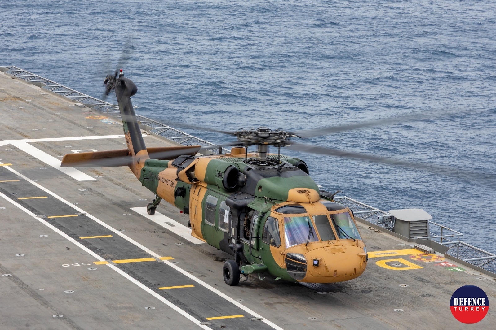 AH-1W Super Cobra helicopters, deployed from the TCG Anadolu LHD, fired CİRİT and AGM-114 Hellfire missiles over Devecitaşı Island, and deployed flares for evasive maneuvering. In parallel, a Sikorsky SH-70 Seahawk helicopter launched from TCG Anadolu executed a TEMREN strike against a surface target. Upon completion of its mission, the Bayraktar TB3 successfully recovered onboard TCG Anadolu in accordance with the exercise scenario.