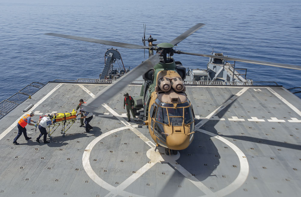 As per the scenario, the survivors were transferred to the TCG Alemdar arriving at the accident scene and the first response to these survivors was made by the Submarine Evacuation and Rescue Team on the ship. During the triage, the medical status of the survivors was examined and the ones facing respiratory distress were located at the two Constant Pressure Chambers, each with 22-person capacity, aboard the TCG Alemdar ship. One of the survivors with a fracture had his x-ray taken in the x-ray room on the ship while a survivor in critical condition had a surgery in the operating room on the aboard. A survivor who needs to be taken to full-fledged hospital on the ground was disembarked with an AS-532 Cougar helicopter of the TLFC.