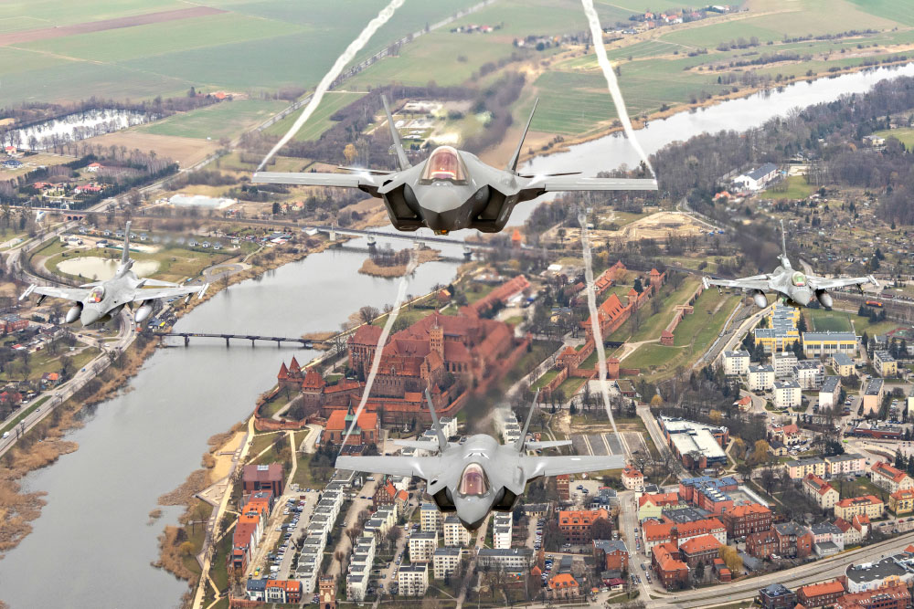 Specially for today, Polish MiG-29 and F-16 fighter aircraft as well as Netherlands F-35 jets took off from Malbork to fly 5th generation integration training in Polish airspace. French Rafale fighters flying out of Šiauliai Air Base, Lithuania, joined them to practice multinational formation flying with two Polish C-295 CASA transport aircraft.