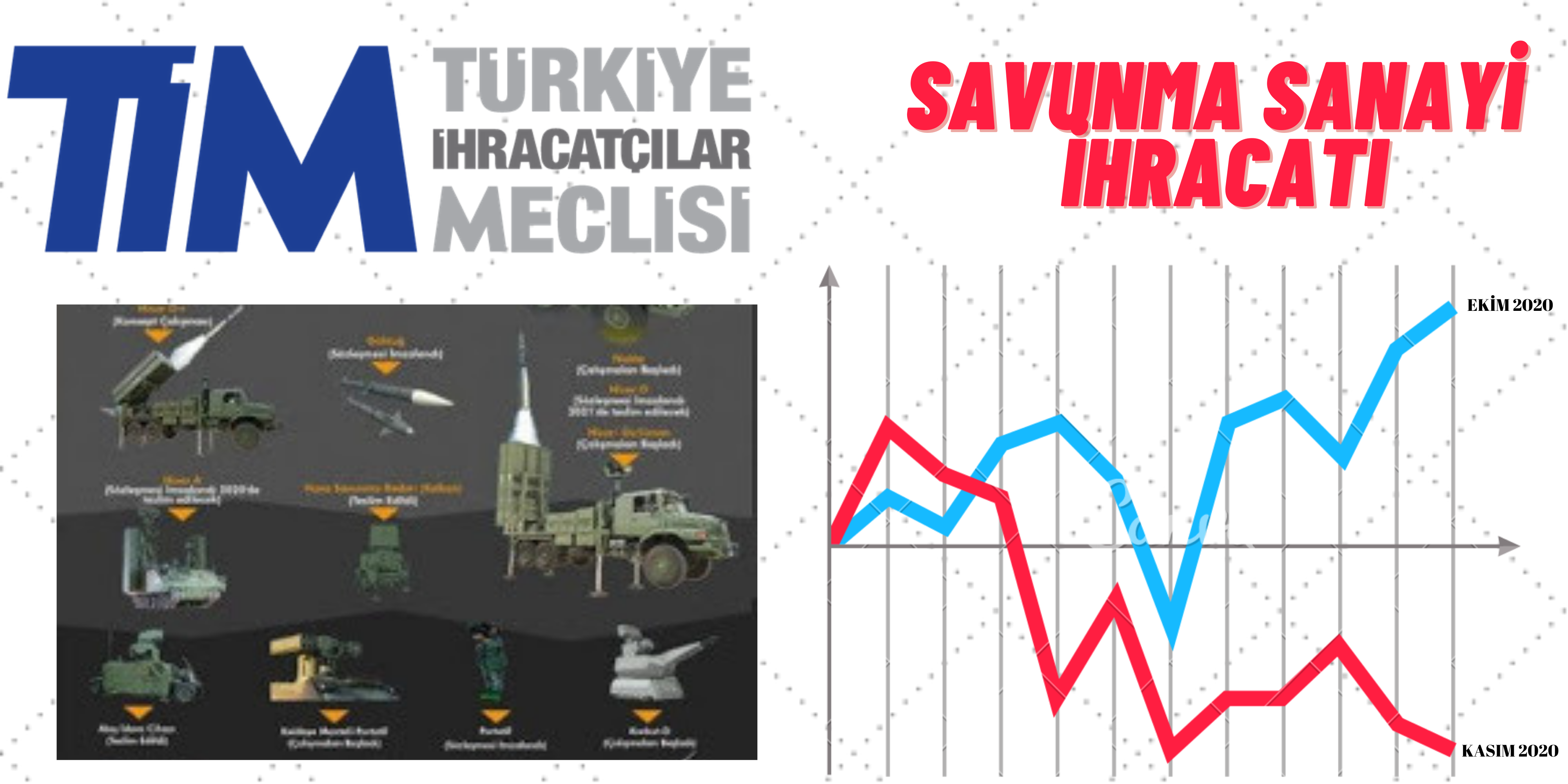 TİM verilerine göre Türk Savunma ve Havacılık Sanayi Kasım 2020’de ABD$191.547 Milyon tutarında savunma ve havacılık ihracatı gerçekleştirmiştir. Bu rakam 2019 Kasım ayı için açıklanan ABD$360.283 Milyon tutarına kıyasla yaklaşık %46,8, ABD$287.184 Milyon’luk (geçen ay ABD$287.973 Milyon olarak hesaplanmıştı) Ekim ayı ihracatına kıyasla da yaklaşık %33’lük bir düşüşü temsil etmektedir. Bu ihracat değeri ile Türk Savunma ve Havacılık Sanayi ihracatta en çok düşüş yaşayan sektör oldu, onu-%40.9 ile Fındık ve Mamülleri ve -%24 ile Çimento, Cam Seramik ve Toprak Ürünleri sektörleri takip etti. Diğer yandan savunma ve havacılık ihracatında yıllık bazdaki düşüş ise %18,4 olarak gerçekleşmiştir. TİM verilerine göre Ocak-Kasım 2019 döneminde 11 aylık ihracat tutarı ABD$2.452 Milyar seviyesinde gerçekleşmişken Ocak-Kasım 2020 döneminde bu rakam ABD$2 Milyar olarak hesaplanmıştır.